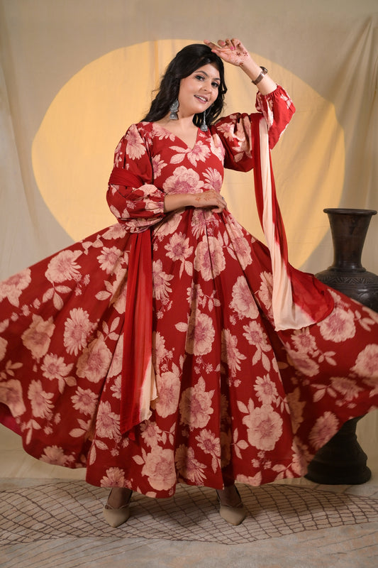 CRIMSON BLOOM PUFFED SLEEVES SUIT SET