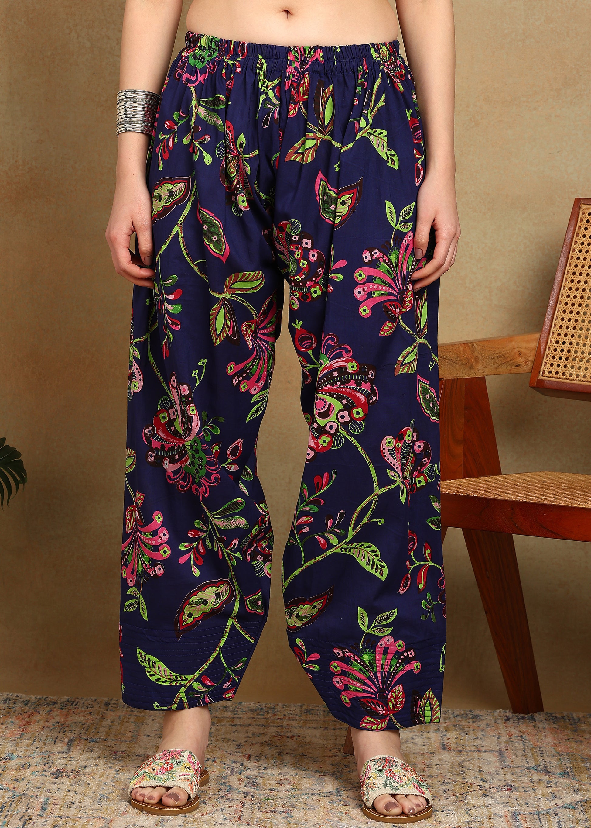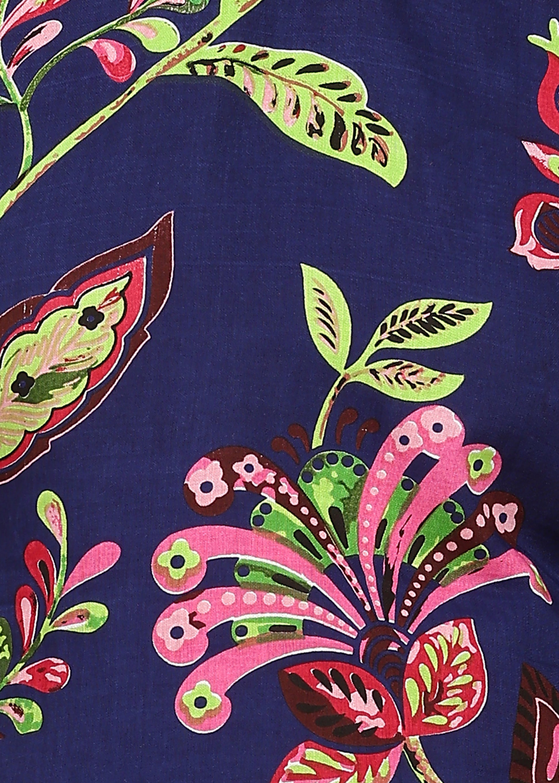 Crafted in a rich navy base with bold multicolour floral motifs, the sleeveless top features a clean straight silhouette with a layered hem for added dimension. The matching relaxed-fit pants ensure maximum comfort while keeping the look coordinated and chic.