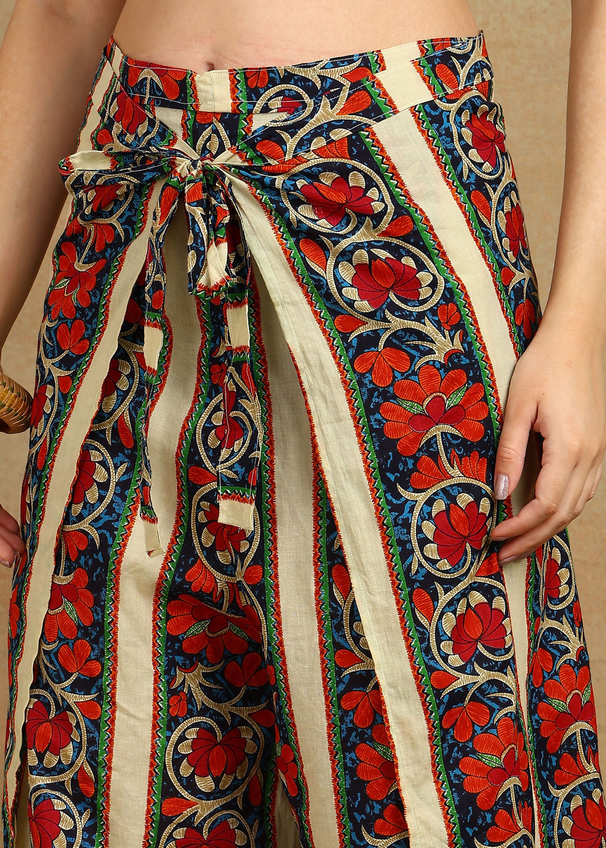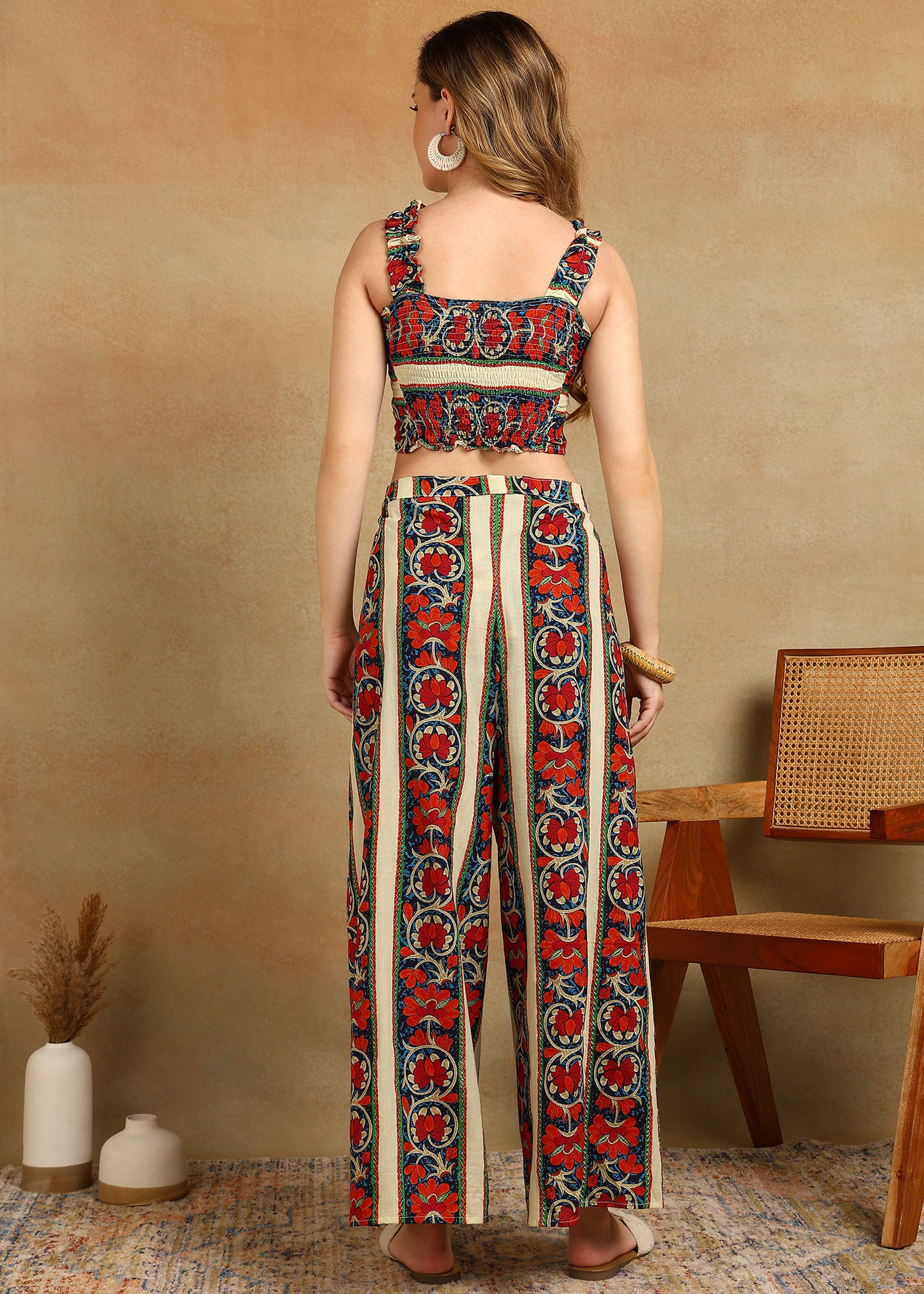 Bring a splash of tradition to your modern wardrobe with this handcrafted floral stripe co-ord set. Designed in breathable cotton, this outfit features a beautifully printed crop top with broad straps and a matching pair of wide-leg pants adorned with vertical floral stripes that elongate your silhouette.