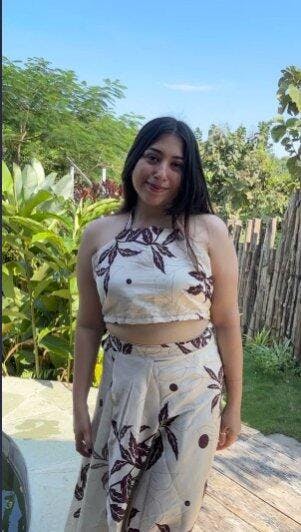 This chic beige co-ord set features a halter neck crop top paired with a stylish wrap-around maxi skirt. Adorned with bold maroon leaf motifs and subtle abstract detailing, it blends earthy tones with modern design. Perfect for brunches, vacations, or evening outings, this outfit exudes effortless elegance and comfort.