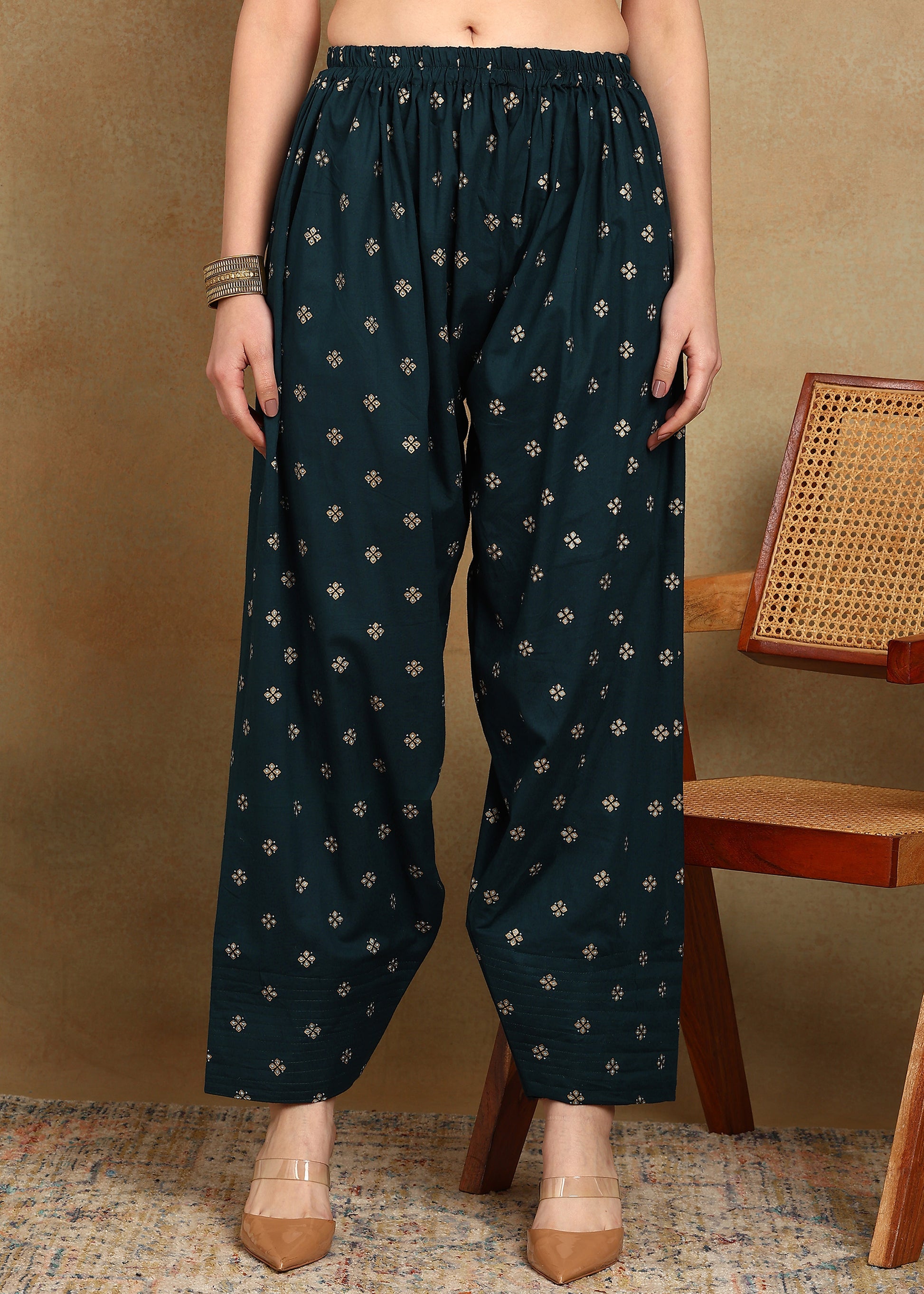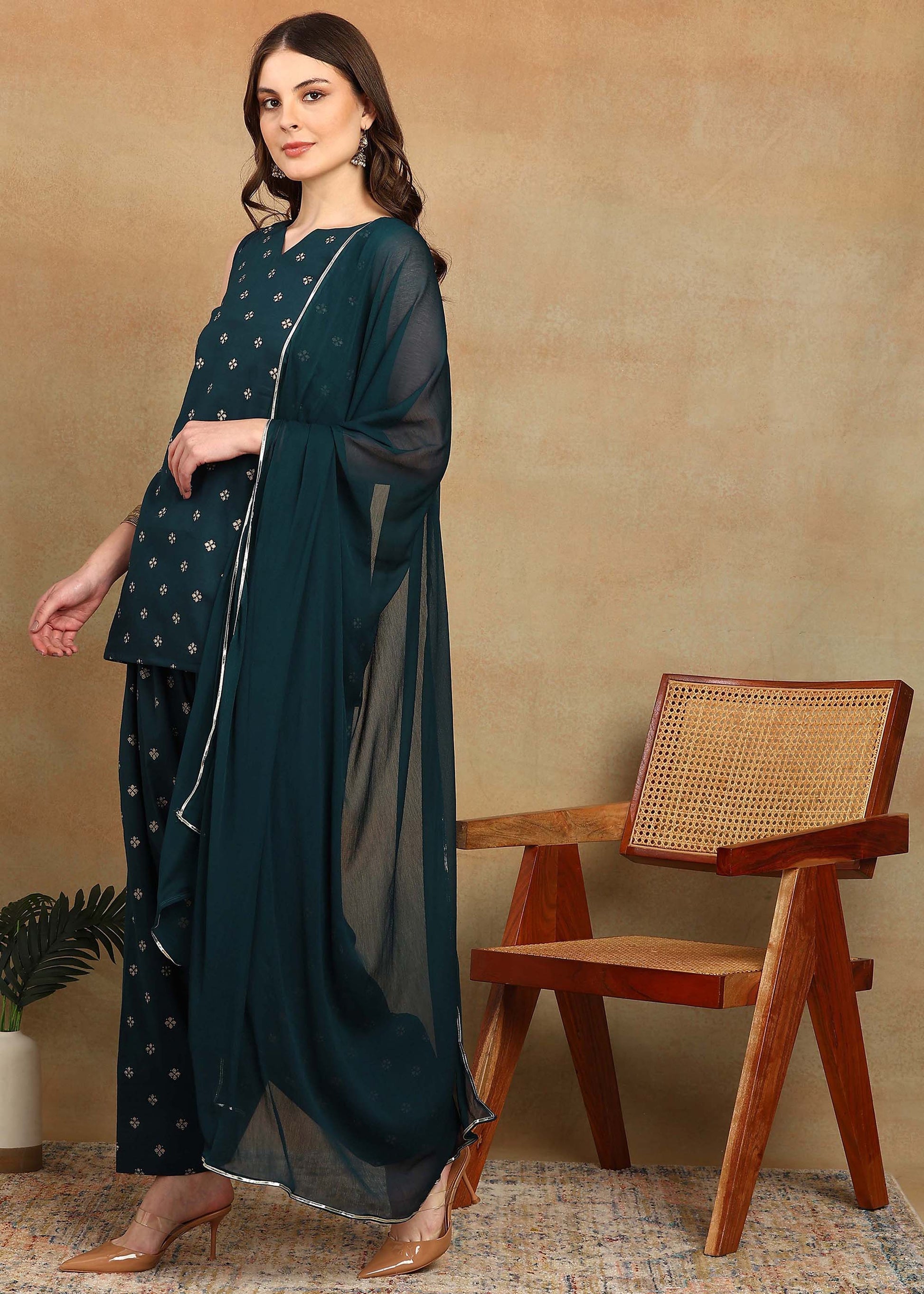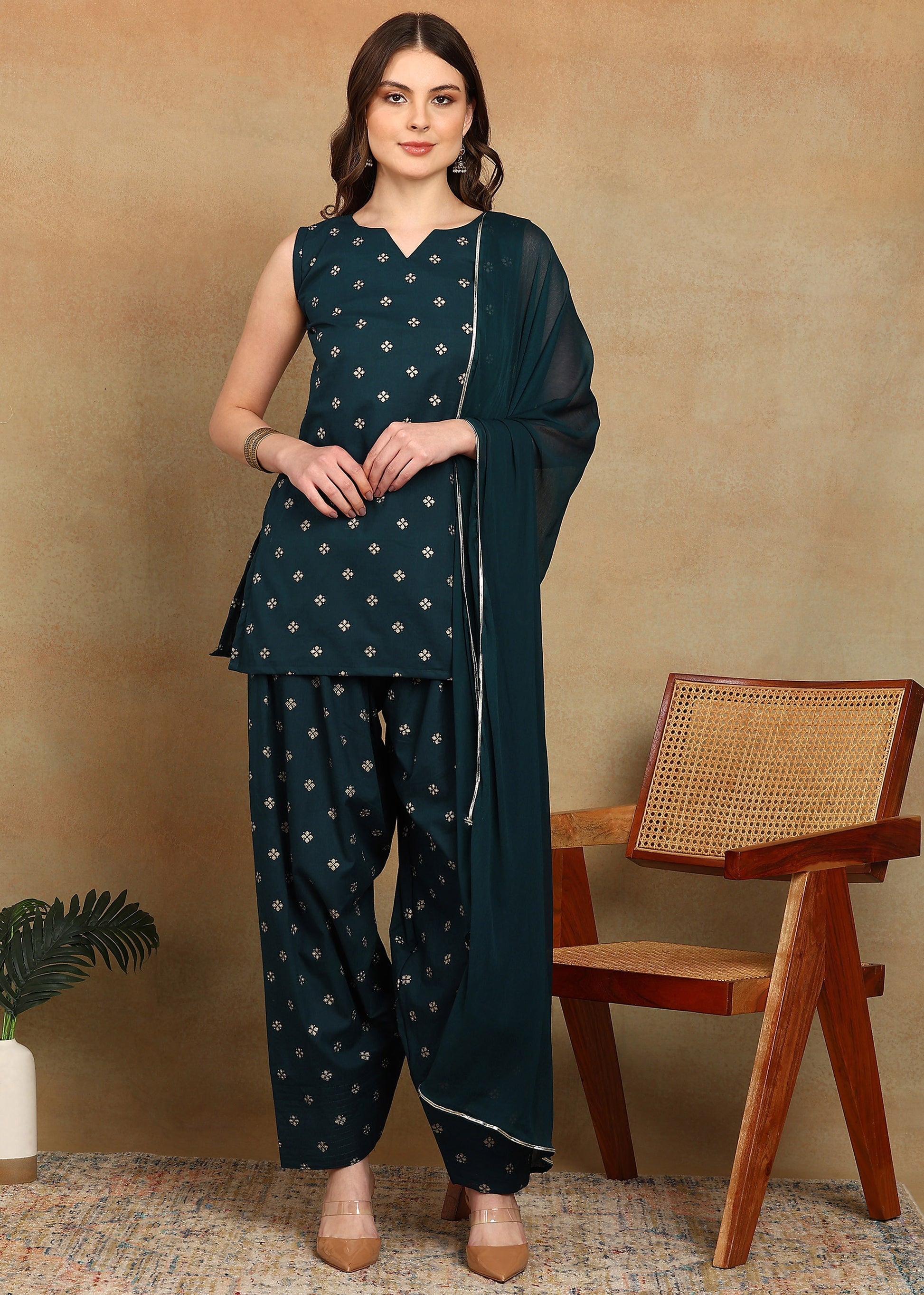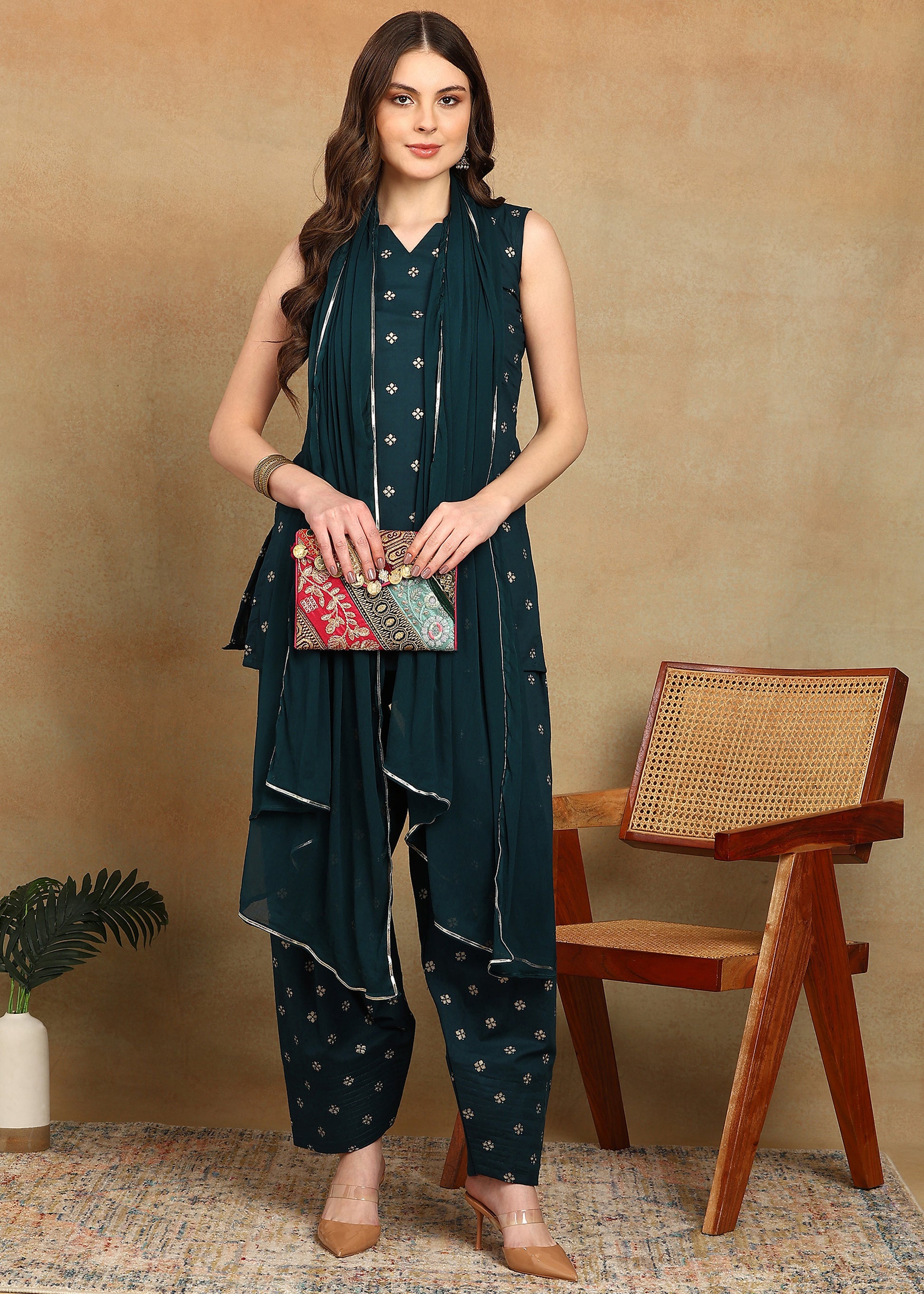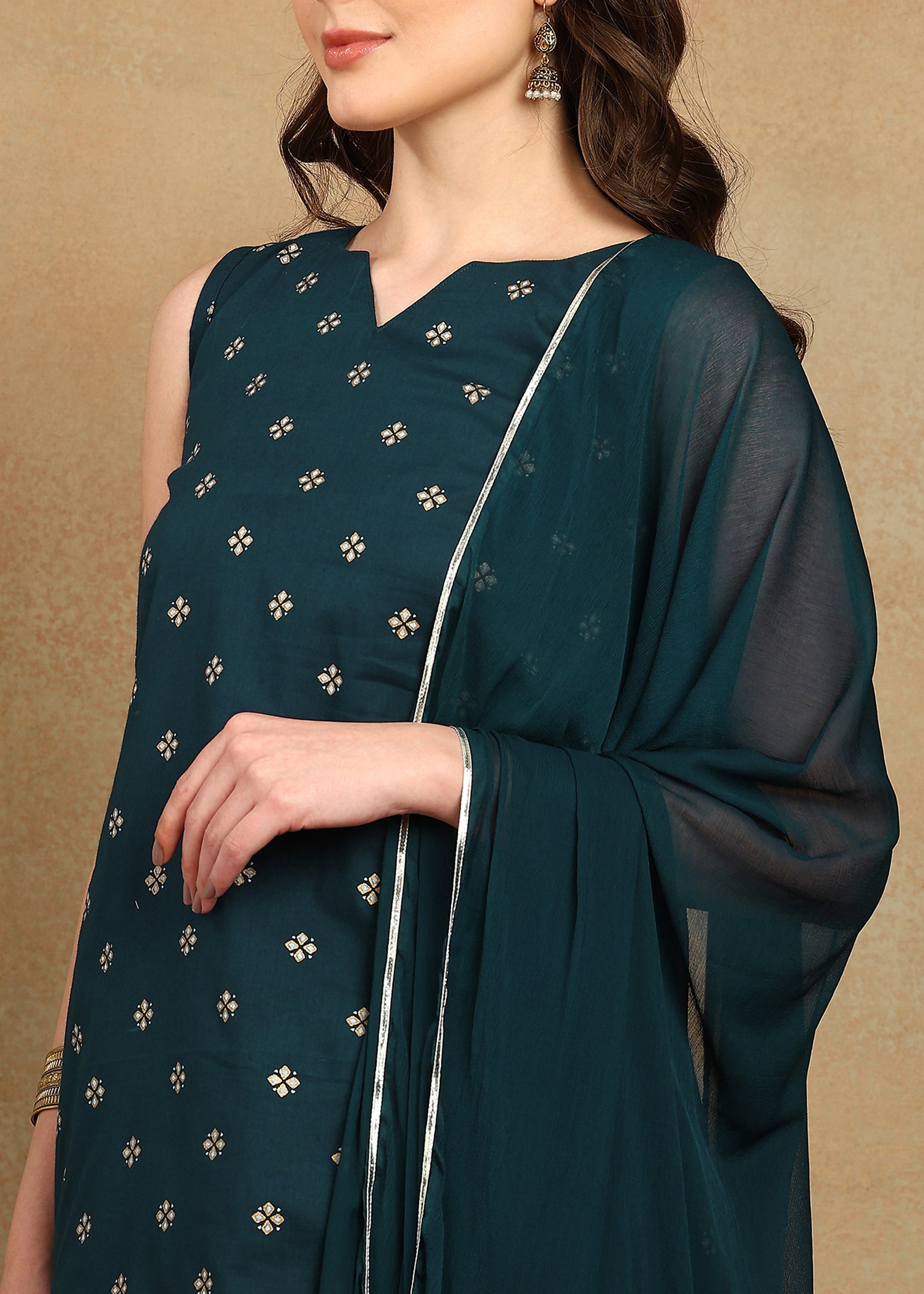 Designed in a deep teal tone, the sleeveless straight kurta is adorned with delicate all-over motifs that add just the right touch of detail without overpowering the look. It is paired with coordinated relaxed pants and a soft matching dupatta finished with subtle border edging — completing a beautifully balanced silhouette.